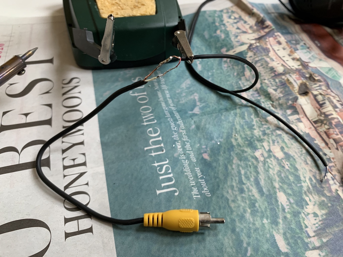 All that I needed now were some headphones. I clipped off the standard audio jack and stripped back the sleeves to reveal 2 wire pairs that I could solder to RCA plugs. In both the RCA cables and headphone cables, the standard copper is ground and the coloured cables are positive. I did a pretty OK job with a battered old soldering iron: